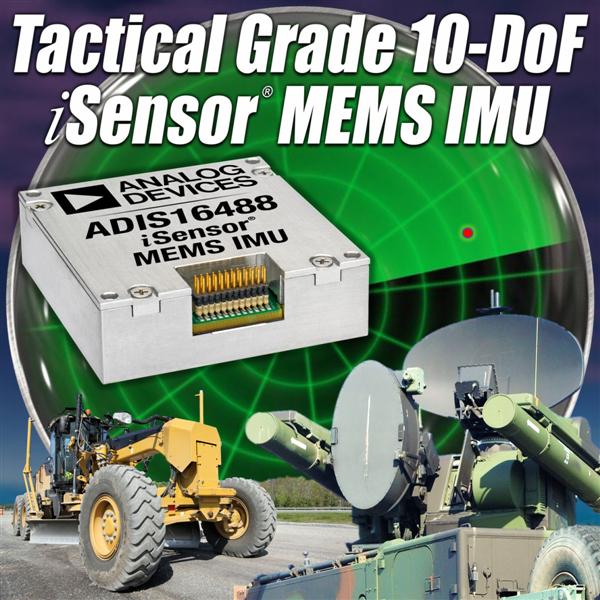 Analog Devices, Inc. (ADI) also released the third generation iSensor® MEMS IMU (inertial measurement unit). The ADIS16488 is a tactical grade 10-degree-of-freedom (DoF) sensor and integrates a tri-axis gyroscope, tri-axis accelerometer, tri-axis magnetometer and a pressure sensor into a single package. This new MEMS IMU provides the most stable and complete integrated sensor suite available, supporting mission critical requirements in high-performance navigation and stabilization applications. Beyond the important tactical grade (below 10o/hr) bias stability, the ADIS16488 outperforms all other contemporary gyro/IMU offerings on the often more critical specifications of g-effect, temperature coefficient, and bandwidth by up to 100X. Further, the new iSensor MEMS IMU even outperforms legacy military grade IMUs on vibration rectification and linearity. Every device undergoes unique and extensive factory calibration, resulting in unparalleled precision in the toughest environments and greatly reduced complexity, time, cost, and design risk relative to typical motion sensor development. Bob continued, "For industrial, military, and medical equipment designers who require the most accurate detection and control of motion in order to stabilize or navigate their applications, the ADIS16488 tactical grade IMU offers performance levels previously only available to those with unlimited budgets. With equal or better performance to legacy high-end IMUs on key measures such as bias stability and angular random walk, the ADIS16488 provides better performance on the often more critical parameters of vibration-rectification, linearity, and bandwidth while consuming one-quarter the power, and at one-tenth the cost."