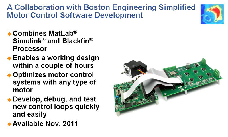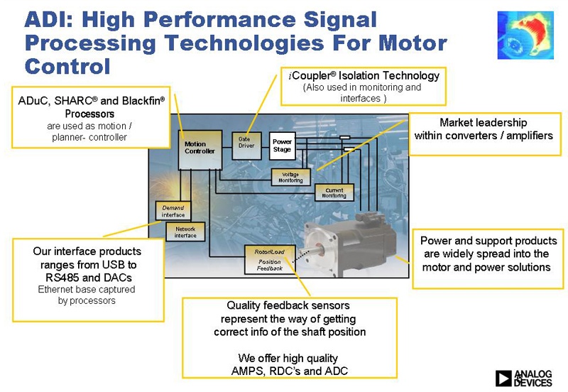 Live demonstrations included: Power Factor Correction Platform Demonstration This demonstration showed visitors how to simplify the adoption of intelligent power management systems using a flexible, digitally-controlled PFC (power factor correction) engine, accurate input metering and GUI interface. The demo included the industry's first digital power factor correction IC with accurate power metering capability. Using continuous-conduction mode PFC techniques, designers can optimize system harmonic performance and maximize efficiency across the load range. Motor Control Development Platform Demonstration This demonstration featured a high performance controller platform used to develop and optimize motor control systems for permanent magnet and other types of motors. Importantly, this demo featured a development tool chain aligned with Matlab/Simulink that incorporates a complete signal chain illustrating ADI's high precision data converters, processors, isolation circuits, and interface and power ICs. Servo and Communication Development Platform Demonstration This development platform demonstrated enhanced internal and external communication capabilities that include design scalability, flexibility, advanced algorithm development and ease of use for use with the growing need for sophisticated higher speed servo motors. The demo highlighted ADI's SHARC® processor and specialized communication modules. ADI also showed a robotic arm with full controller flexibility using a LabVIEW® tool. Isolated CAN Network Demonstration This demonstration showed the seamless integration of an isolated CAN transceiver over an isolated CAN network. The demo highlighted the application of ADI's evaluation tool kit to a robotic arm control.