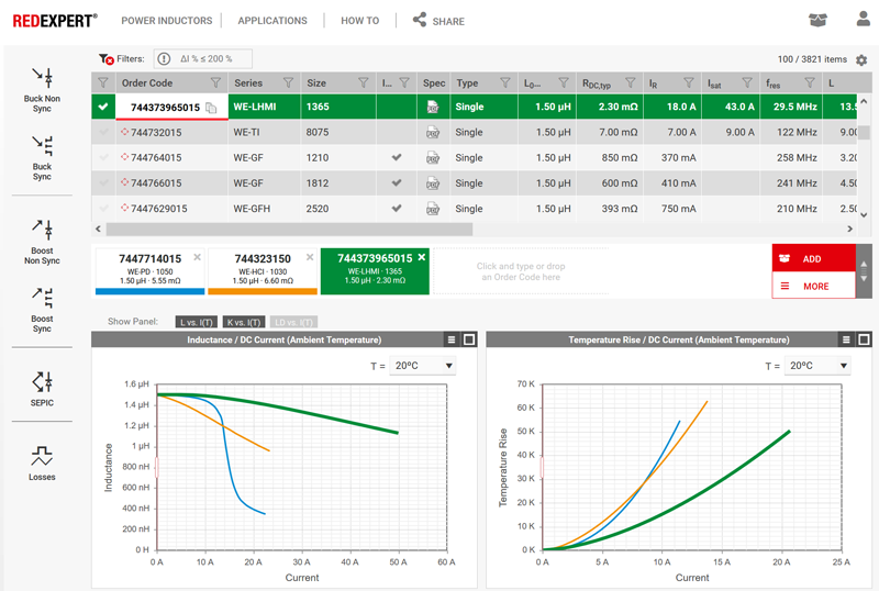 Over the years Würth ElektronikeiSos has taken thousands and thousands of measurements of inductors in its portfolio. This rich set of data has been reduced to equations that give the AC losses for the inductors based on the operating frequency, duty cycle, DC bias, ripple current, etc. It is important to realize this is not a design formula because the measurements used to generate the formulae are all component specific considering the construction methods and materials. This is why it is so precise. The Würth ElektronikeiSos online selection tool, REDEXPERT (Figure 5) provides a very convenient way to access this information and compare multiple inductors instantly.