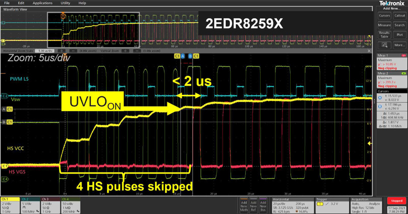 For instance, using dual-channel galvanically isolated gate driver ICs with a typical UVLO startup time of 2 µs in a bootstrapped high-side configuration results in skipping only about four high-side pulses until the half-bridge can start operating (assuming a typical VDD rise rate on the high-side). In contrast, a similar gate driver IC with a UVLO startup time of 10 µs or higher can easily lead to skipping ten or more high-side pulses. This significantly delays starting the half-bridge operation, as shown in Figure 2.