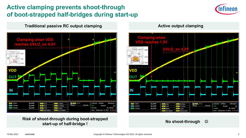 In contrast, gate driver ICs with slow internal RC clamping circuits cause a certain level of shoot-through during half-bridge startup, until VDD rises sufficiently to activate output clamping. This leads to electrical overstress for the switching devices.