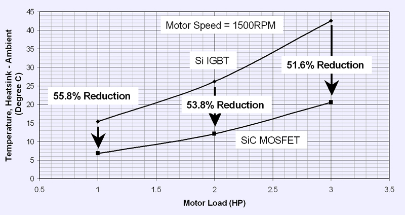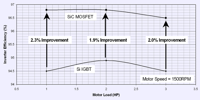Silicon-carbide technology has the potential to enhance performance in numerous high-power applications. However, many power electronics engineers may have questions about the readiness of SiC power devices for their current design projects and the impact these devices may have on their designs. In a recent article in How2Power Today, Paul Kierstead of Cree assesses the readiness and potential impact SiC MOSFETs and Schottky diodes on motor-drive applications. In Silicon Carbide Power Solutions Are Ready To Revolutionize Motor Drives, Kierstead analyzes the impact of his company's high-performance transistors and diodes on a standard variable-frequency motor drive. The author breaks down the application into its three major power conversion functions: the dc-ac power inverter responsible for driving the motor the ac-dc rectifier section with built-in regen function and the auxiliary power supply that powers digital control and other functions. Focusing on each of these sections, Kierstead explains how replacing silicon IGBTs and fast-recovery PiN diodes with SiC MOSFETs and Schottkys achieves benefits such as higher efficiency, simplified topologies, reduced parts counts, smaller components, and higher-frequency operation. In particular, data is presented to support the claims of improved efficiency enabled by the SiC devices (see figure).