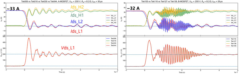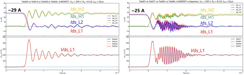 The evaluation of parallel SiC MOSFET circuits shows that variations in key device parameters - including threshold voltage (Vth) and on-resistance (Ron) - significantly affect oscillation. Closely matched devices enable even current sharing and stable switching. In contrast, increased differences in Vth and Ron result in uneven current sharing, causing more frequent and severe voltage and current spikes, particularly at higher currents where parasitic effects intensify. These findings underline the importance of selecting devices with similar characteristics, carefully designing to minimize parameter variations, suppressing oscillations and ensuring reliable high-power SiC MOSFET operation (See Figure 3).