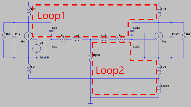 · Oscillation suppression: Lowering the shared resistor (Rgex) among parallel MOSFETs attenuates the signal in Loop1 (Figure 5), diverting some to ground suppressing oscillation. If Rgex is too high, attenuation is insufficient, making oscillations more likely.