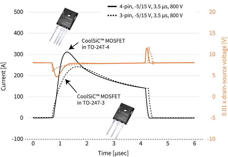 Figure 2. Short-circuit behavior of Infineon’s 1200 V CoolSiC™ MOSFET in different package configurations (with and without source sense)
