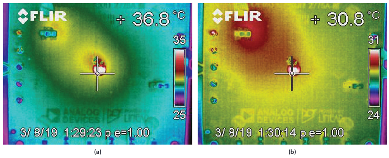 Figure 4: Thermal performance comparison: (a) 100mA charging current at 4.1V output, (b) 10mA charging current at 4.2V output