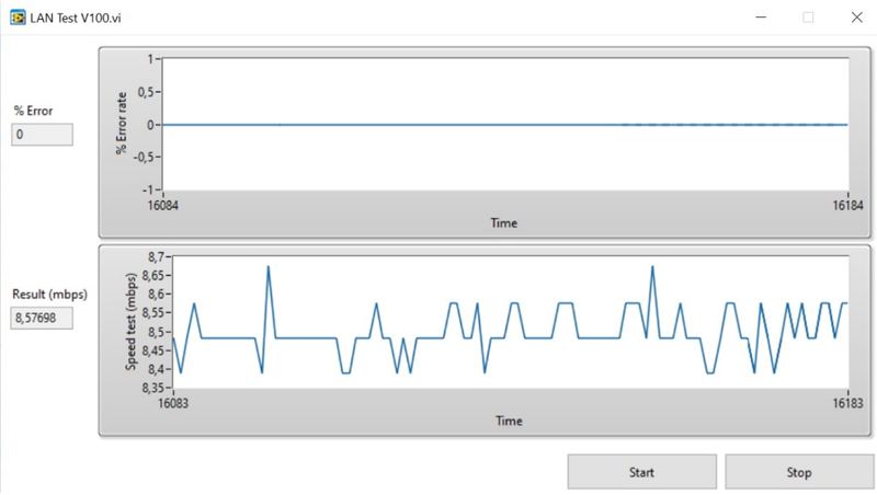 Figure 3 shows that an average transmission rate of slightly less than 9 Mbit/s can be achieved. In the selected test case, the packets have a short transmission time compared to the tests on the Gigabit Ethernet interface. During the tests, it is therefore possible to test with a measurement and reaction time of one second.
