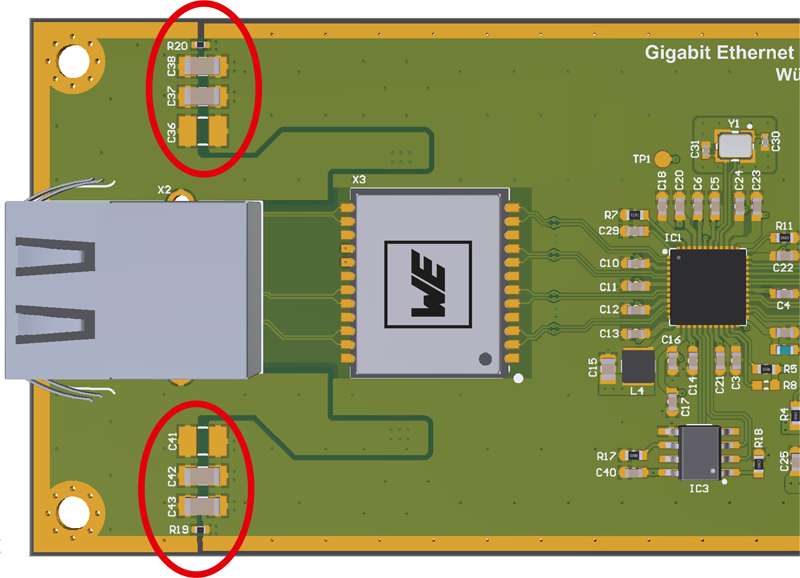 Figure 4: Shield connection of the Ethernet socket according to ANP116. There is an MLCC on each side, the varistor is not shown