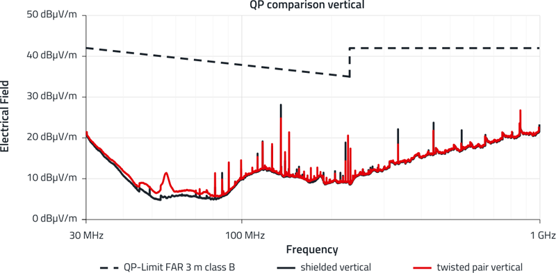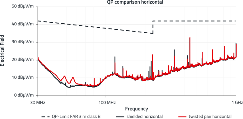 The interference spectrum of the reference design in Figure 5 is at least 9 dB below the limit value for both cable types used and the results are comparable.