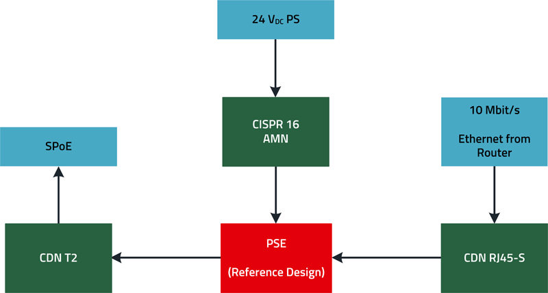 The PSE and the PD may be physically separated in the subsequent setup and are therefore tested individually. The DC input of the PSE is to be tested as a possible DC mains input, the Ethernet cable of the 10 Mbit/s Ethernet interface and SPoE interface are to be regarded as a long network cable. The emission of the DC input on the PSE is measured in accordance with CISPR 16 with a 50 µH AMN (Artificial Mains Network), the emission of the network ports is measured using 150 ΩCDNs (Coupling Decoupling Network), which act as an AAN (Asymmetric Artificial Network). The test setups for measuring the radio interference voltage at the PSE and PD are shown inFigures 6 and7.