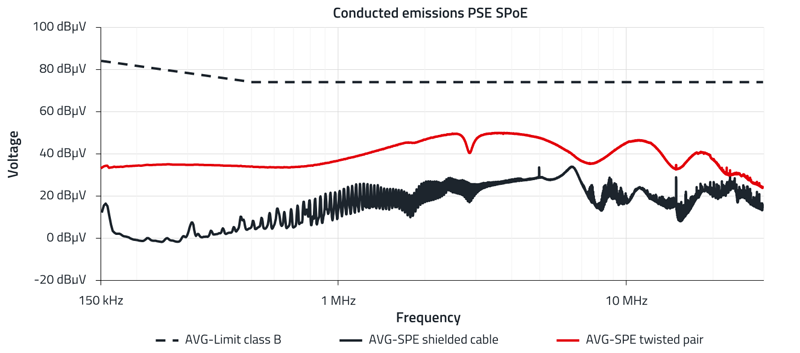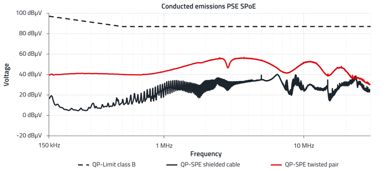 The SPoE reference design is characterized by low radiated and conducted emissions. Despite open circuit boards without a shielded housing, the emission results are well below the EMC limit values for residential areas. Even with an unshielded twisted pair cable, the results of the SPoE interface are well below the EMC limit values for all measurements. From the point of view of emission testing, shielding of the SPoE interface is therefore not necessary.