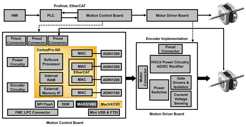 Figure 2: Block diagram of an industrial motion control system integrating a Motion Control Board and Motion Driver Board
