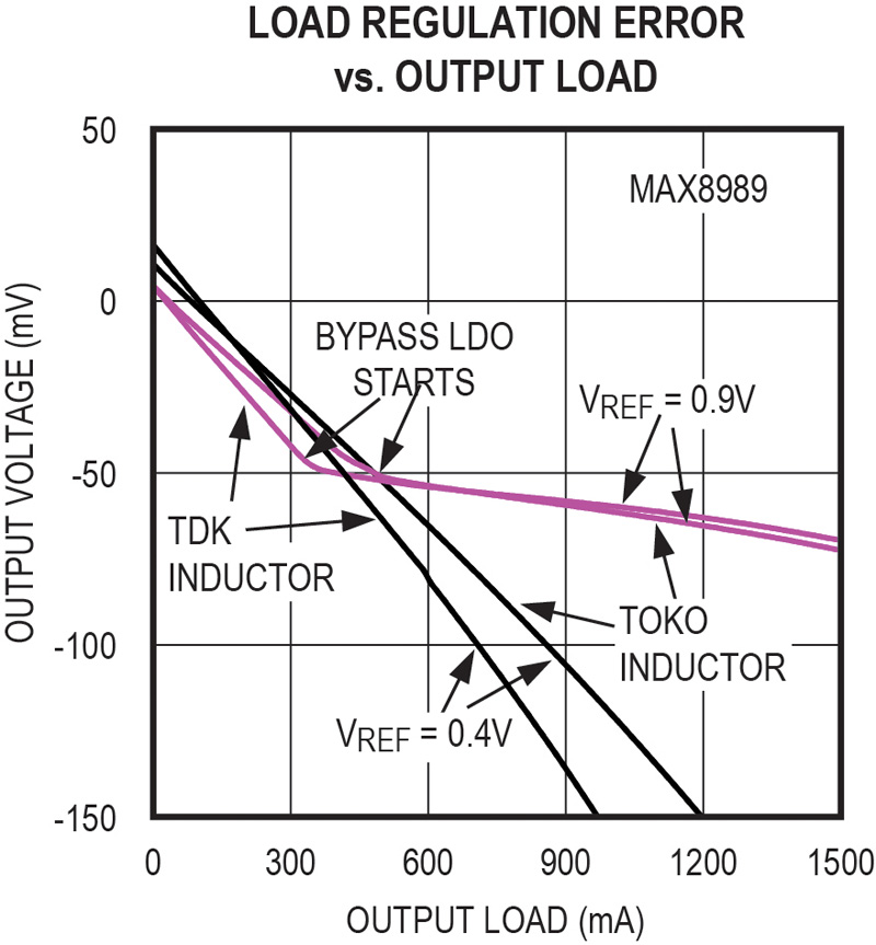 Use a bypass LDO to remove voltage "jump" Figure 1 also shows the improvement of a bypass LED over a bypass FET. This LDO provides a smooth transition between step-down regulation and operation in dropout. Two bypass LDO examples are presented using the MAX8989 and MAX8951. We start by looking at the MAX8989, where the relation between the output voltage and REFIN voltage is: VOUT = 2 × VREFIN - 0.5 × DCRIND × IOUT When the MAX8989 output voltage drops by more than 50mV due to load regulation (0.5 × DCRIND × IOUT > 50mV) and the output voltage is above the linear bypass enable threshold (1.4V, typ), the bypass LDO supplies supplementary current to the output to keep the output voltage in regulation. Figure 2 illustrates the effect of the bypass LDO on output voltage regulation. Here, the bypass LDO is disabled in the case of VREFIN = 0.4V; for VREFIN = 0.9V, the bypass LDO begins operation when the output voltage drops 50mV and the load regulation ramps down at a slower rate. Two inductors (a TOKO® DFE252012C-4R7 and a TDK® VLS252015ET-4R7M) are used and noted in Figure 2. With different inductors, the bypass LDO starts at the same 50mV point. But since the TDK inductor has bigger DCR and causes a higher voltage drop across the inductor, the bypass LDO begins operation at a lower output current. When the output current exceeds the step-down converter's current limit, the bypass LDO provides supplementary current to the output, thereby ensuring a stable output voltage. The bypass LDO does not provide any supply current before the step-down converter gets to its current limit. While the linear bypass regulator is sourcing current, the step-down converter continues to supply most of the load to maximize efficiency.