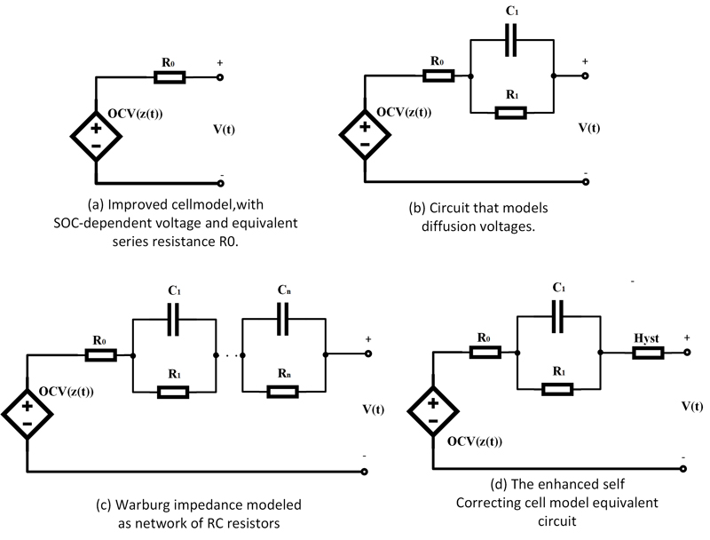 When including the hysteresis in the previous models, we can introduce the enhanced self-correcting cell model that combines all the previous phenomenon (OCV dependency, diffusion voltage, Warburg impedance, hysteresis). Figure 6 (d) shows an example with single parallel RC, but we can imagine the same model with an RC network easily.