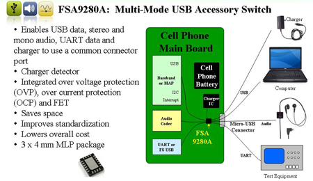 Through its signal path expertise, Fairchild's micro-USB switch (FSA9280A) and USB transceiver (FUSB2500) bring significant design advantages to the mobile space:
