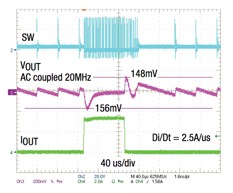 Figure 6. The XR79206 executes a load step from 0.05A to 3A by seamlessly changing from DCM to CCM