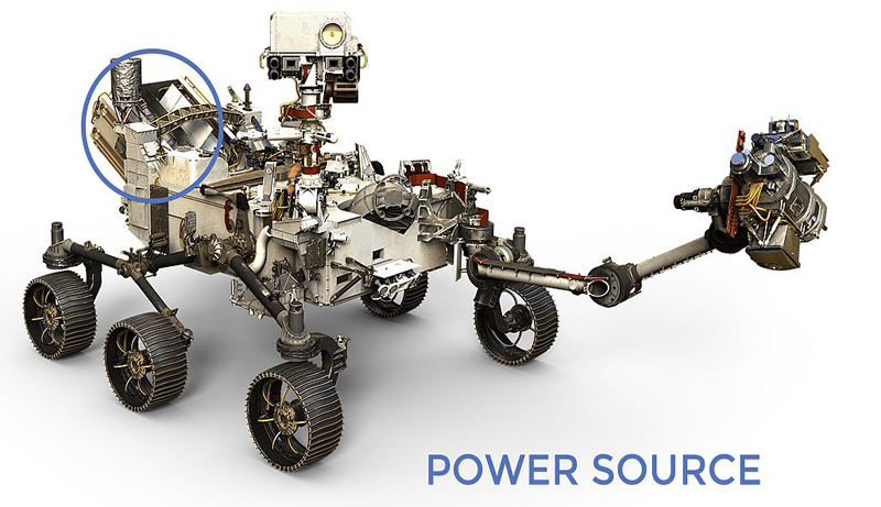 Figure 6. Mars 2020 Rover MMRTG power source circled in blue (Image courtesy of NASA)
