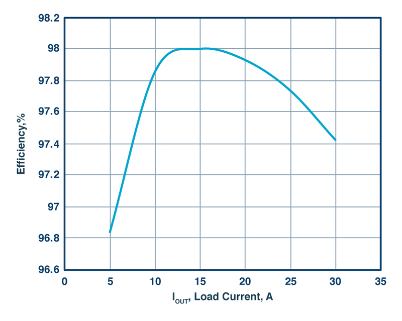 To convert the dual output controller to a single output, the ITH, FB, and RUN pins of one channel are connected to the corresponding pins of the second channel. To minimize gate losses, the gate voltage of DRVCC is selected as 9 V by setting resistor RG off the DRVSET pin. Figure 4 presents the efficiency of the single output converter. DC2493A was used for evaluation.