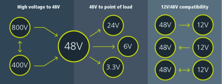 This portfolio can be visualized as being partitioned into three areas. The first (left in the image above) is from high voltage (400V and 800V) to 48V. This is of particular interest in the electric vehicle (EV) automotive arena, where 400V batteries are transitioning to 800V.
