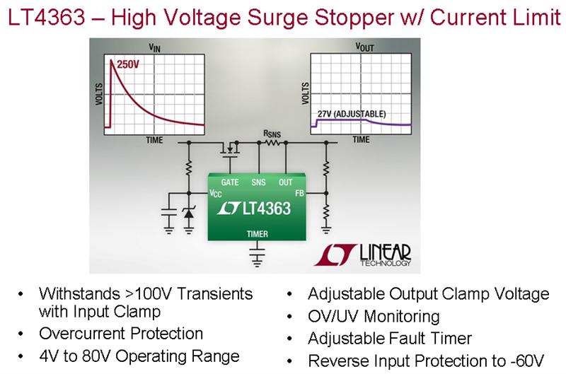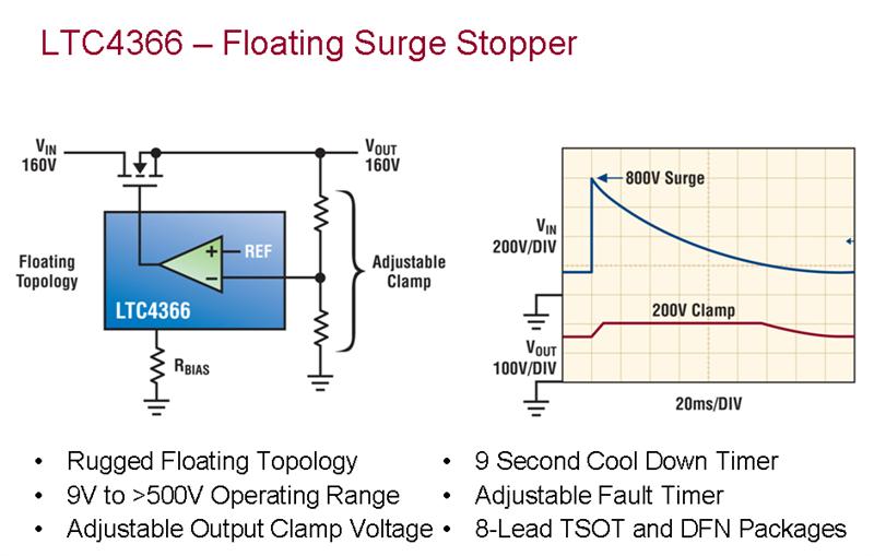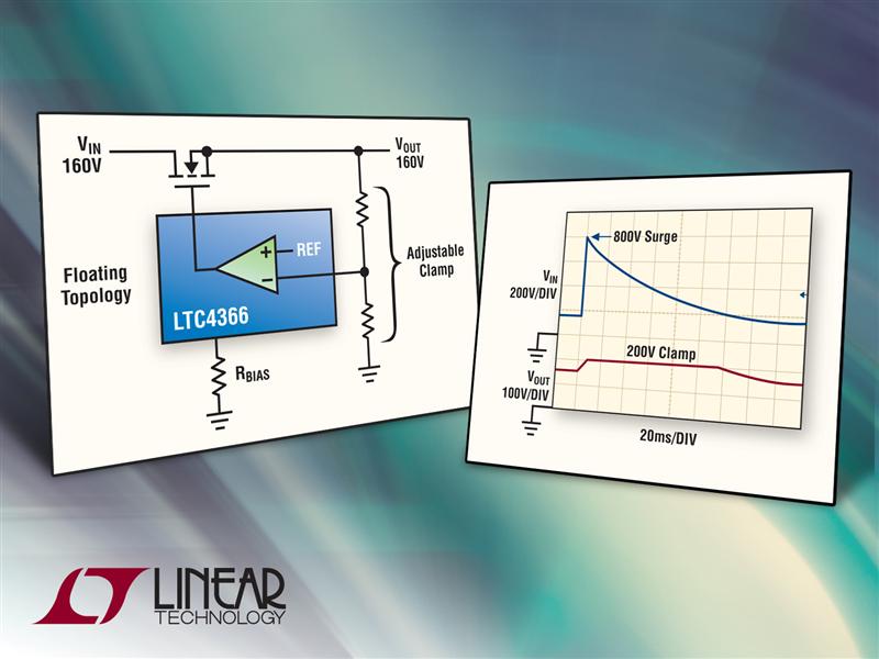 Linear's LTC4366, an overvoltage protection controller for electronic systems operates from 9V to greater than 500V, the LTC4366 floating surge stopper utilizes an adjustable floating topology to enable very high voltage operation independent of the voltage rating of the LTC4366's internal circuitry. Two internal shunt regulators coupled with the external voltage-dropping resistors generate the LTC4366's internal supply rails. The maximum operating voltage is set by the breakdown of the external resistors and MOSFETS. The LTC4366 is the first product of its kind to protect, for example, a 12V circuit from a 500V transient without the need for additional protection components. The LTC4366 monitors the voltage at its output and reacts quickly to input supply overvoltage by controlling the gate of an N-channel MOSFET. The LTC4366 regulates the output to a user-defined voltage during an overvoltage transient allowing the load to remain operational while the overvoltage is dropped across a MOSFET. An adjustable fault timer ensures safe shutdown if the fault persists. The LTC4366 is ideal for harsh industrial, automotive and avionic applications where systems must continue operating reliably through severe overvoltage events.