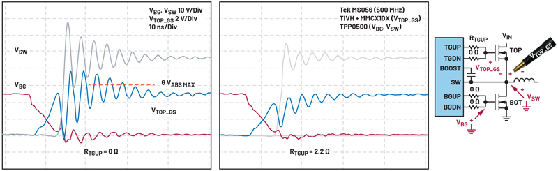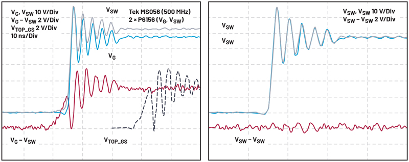Figure 3 shows the gate and switch waveforms of a GaN-based step-down (buck) converter. Without a series gate turn-on resistor, the TOPFET’s gate-source voltage (VTOP_GS) exceeds the GaN FET’s specified +6 V maximum gate-source voltage rating. Adding a 2.2 Ω TGUP resistor reduces VTOP_GS and dampens gate and switch node ringing. High impedance oscilloscope probes capture the ground-referenced low-side gate (VBG) and switch node (VSW) waveforms. The TOP FET’s source (VSW) alternates between VIN and ground. The GaN’s high slew rate (over 30 V/ns) and 300MHz ringing exceed the practical common-mode limit of differential probes typically used to make VTOP_GS measurements. Fortunately, available optically isolated probes make this measurement possible. These probes, pioneered by Tektronix’s IsoVu technology, feature unbelievably high frequency common-mode rejection ratio (CMRR) and are priced accordingly.