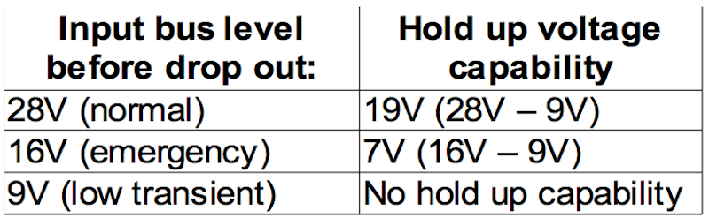 This power interruption duration can range from 50ms, all the way to 1000ms for DO160 or Mil-Std 704 standards, for example. The simplest way to achieve such a hold up function is to connect to input bus a huge tank capacitor that will store energy during normal operation, and restore it during power interruption.