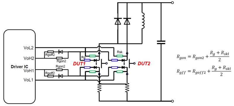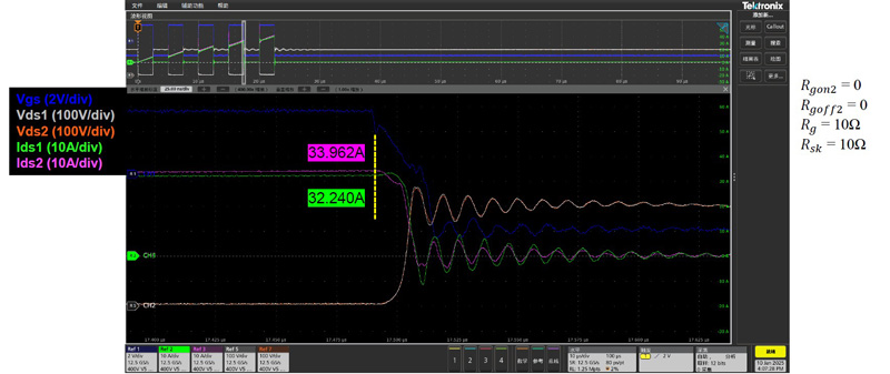 As well as showing device performance, the double-pulse test is also highly effective at showing how well-balanced devices are in a parallel configuration. With devices that are difficult to balance effectively, the current flow during each pulse will show one device dominating the other. In practical applications, this would be undesirable as it implies one device will suffer increased stress, which in turn would lead to reliability issues. It would also prevent the circuit from taking full advantage of the improvements that are theoretically achievable with a parallel configuration.