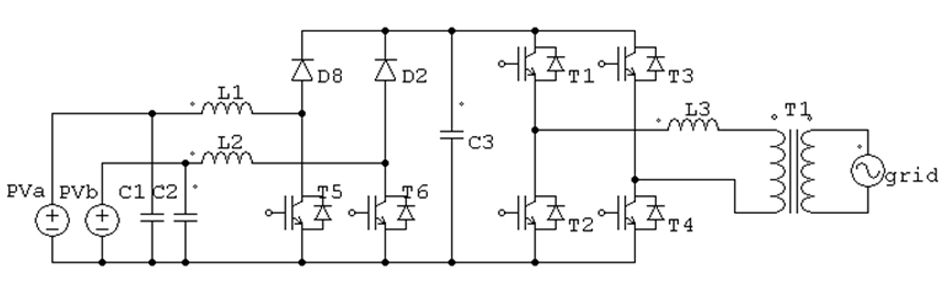 This article describes a dual input two stage grid-tied PV inverter by using Mitsubishi Photovoltaic Intelligent Power Modules (PV-IPM) of type number PM50B6LA060. Dual circuit branches have independent boost converters and tracking control of maximum power, which can be connected with various PV arrays and make the PV system easy to use. Small and decentralized power supplies such as used for photovoltaic generation, wind power generation, and fuel cells are in greater demand due to the rise in environmental concern. In addition, an increase in the use of domestic photovoltaic generation systems and fuel cell systems is expected in future. Because the voltage generated in these systems is DC, it is necessary to convert the DC voltage into an AC voltage for use in the home. The device used for the DC-AC conversion is a power conditioner, and a semiconductor power device is used within such a system. High Efficiency is needed in the power conditioner, and so a semiconductor power device with low loss is requested. Mitsubishi Electric Co., Ltd has developed an IPM for the photovoltaic generation to have satisfied such a demand. The internal circuit of a photovoltaic intelligent power module (PV-IPM) is shown in Fig.1. It integrates single phase output inverter circuit, two chopper circuits (one chopper circuit for some types and without chopper circuit for other types) and control IC into a small package. The PV-IPM adopts an innovative CSTBTTM chip technology to achieve low power loss. There is a thermal sensor mounted on the surface of each IGBT chip so that junction temperature (Tj) can be monitored accurately.