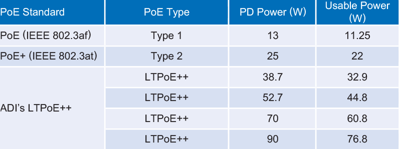 The supply of power via a Cat-5 cable is defined in the IEEE 802.3af Power over Ethernet standard. The PoE standards used to be limited to a few watts, but newer PoE technologies enable even higher power. For example, PoE+ allows power up to 25W per port and PoE++ (a four-pair Power over Ethernet system) ranges from 70W to 100W by using all of the wires of the existing cable. In parallel to this PoE standard, Analog Devices has defined the proprietary standard LTPoE++™, which defines the specifications up to 90W powered device (PD) power (see Table 1).