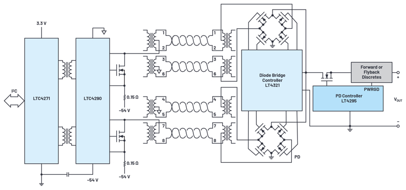 An increase in the power and efficiency of the overall PoE system can be achieved if the two diodes of the full-bridge rectifier on the PD side are replaced by ideal diodes. Therefore, MOSFETs are used and controlled such that they act like typical diodes. Through this, the forward voltage can be drastically lowered due to the low channel resistance (RDS(ON)). With the LT4321 ideal diode bridge controller in combination with the LT4295 PD controller, four MOSFETs can be controlled in a full-bridge configuration (see Figure 3).