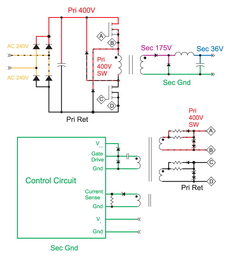 Figure 1 shows the forward converter schematic, simplified to a single output stage to illustrate the issues that arise with voltage spacing. The voltages that can exist on each trace are marked in different colors on this schematic.