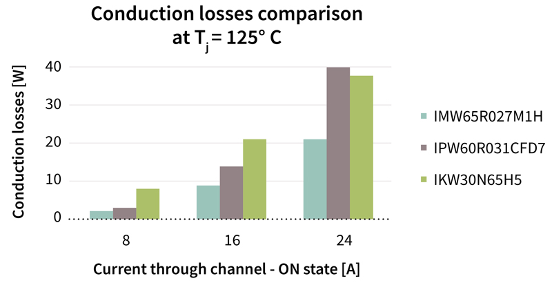 Figure 2a shows the conduction loss comparison of three best in class devices including IGBT IKW30N65H5 (650 V), SJ MOSFET IPW60R031CFD7 (600 V) and SiC MOSFET IMW65R027M1H (650 V) at a junction temperature of 25°C. Figure 2b displays how conduction losses change over varying currents at 125°C. Firstly, as can be seen, the conduction losses of IGBTs are significantly higher than of the other devices at 25 °C, however, it doesn't rise significantly as temperature increases to 125 °C. Secondly, also shown in the graph that the conduction loss of the SJ MOSFET at 125°C is two times higher than at 25°C for the same device. Thirdly, looking at the data of the SiC MOSFET, it shows only approximately 20 percent conduction loss increase over this temperature range. This makes a clear difference between Si and SiC MOSFET technologies, especially at high current, high-temperature operating conditions.