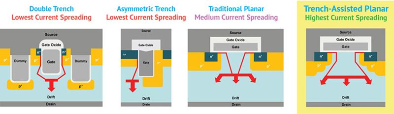 Figure 2: Schematic view of current spreading in traditional planar double trench, asymmetric trench, traditional planar, and trench-assisted planar technologies