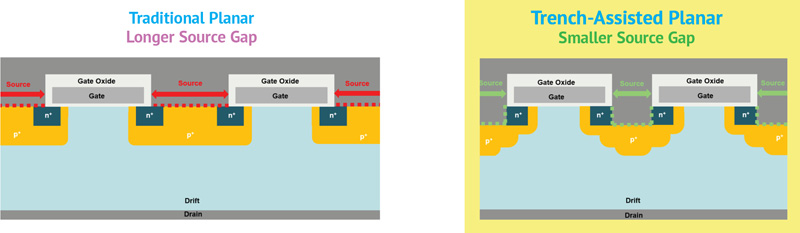Figure 3: Cross-sectional view of source region in a traditional planar (left) and trench assisted planar (right)