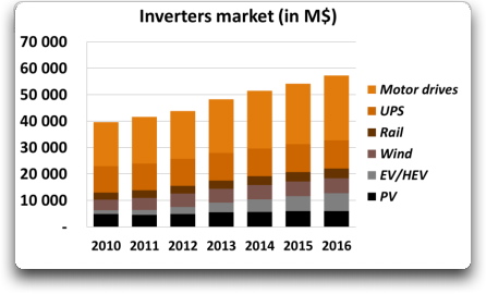 Continued strong interest in green energy, power electronics for electricity conversion is experiencing important growth. Starting with a total inverter market size of almost $44 billion in 2012, Yole Développement estimates that it should reach more than $55 billion by 2016, with a high CAGR for applications such as EV/HEVs and renewable energy. In its recent reports, Inverter Technology Trends & Market Expectations, Yole anticipates the overall shipments of inverters for every power range should reach almost 28 million units. As a consequence, semiconductor power modules marketmostly driven by IGBT moduleswill also reach important values: $1.64 billion in 2012 thanks to EV/HEV applications having a 29% CAGR from 2011 to 2016.