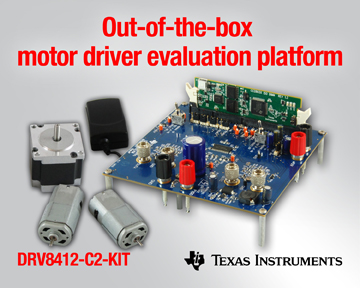 Texas Instruments Incorporated introduced the first in a new line of scalable evaluation platforms for spinning motors. The DRV8412 evaluation kit (DRV8412-C2-KIT) includes all of the hardware and