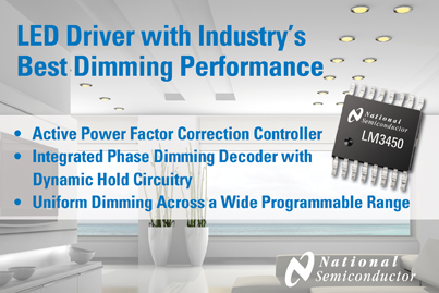 National Semiconductor Corp. has introduced a new LED driver with the industry's best phase-based dimming performance for high-brightness light-emitting diode (LED) applications. The LM3450 LED driver