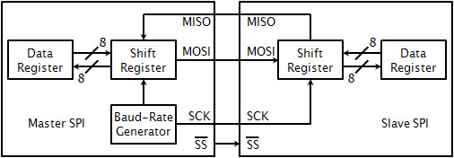 Figure 1: The 8-bit data registers in the SPI Master and Slave devices link through the MISO and MOSI signals to form a 16-bit control register. (Click image to enlarge.)
